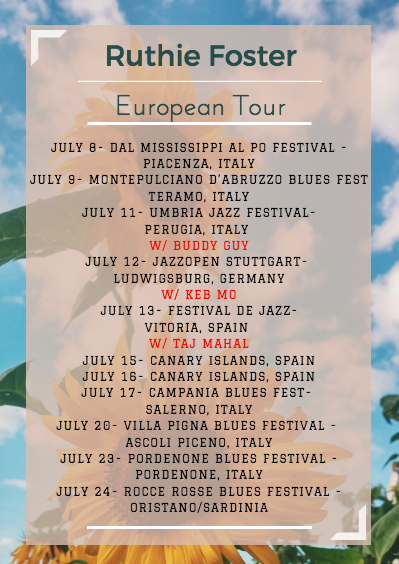 Ruthie is gearing up for her summer 2016 European tour, which features some great festivals and has her playing with some great people - Buddy Guy, Taj Mahal and Keb Mo- plus a lot of dates in Italy and the band's first trip ever to the Canary Islands!